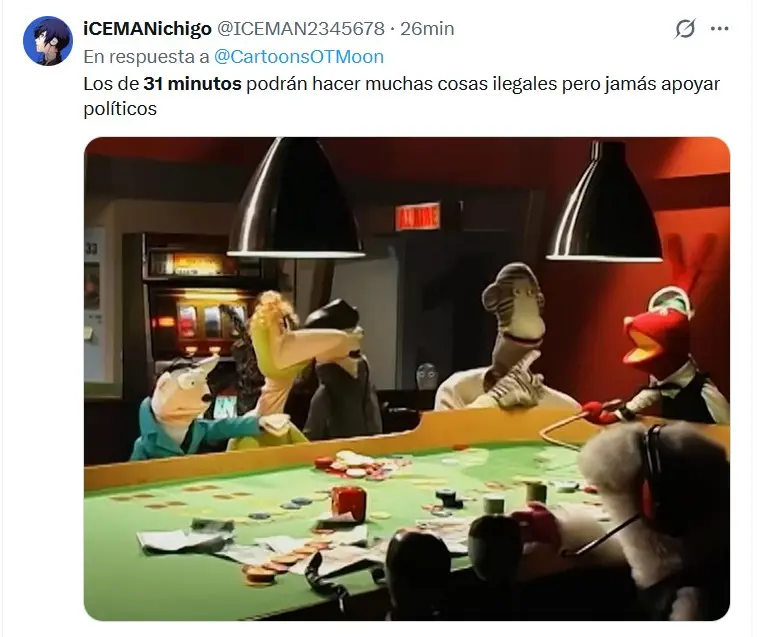 “Cómo se te ocurre usar nuestra imagen en tu campaña. 31 Minutos nunca participará en campañas políticas, menos en lugares donde su contingencia nos es totalmente ajena. Lo tuyo es una falta total de respeto a nuestra creación y un uso completamente ilegal de la marca y sus personajes”.