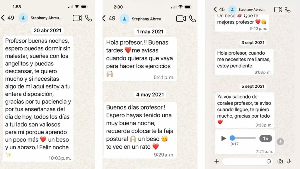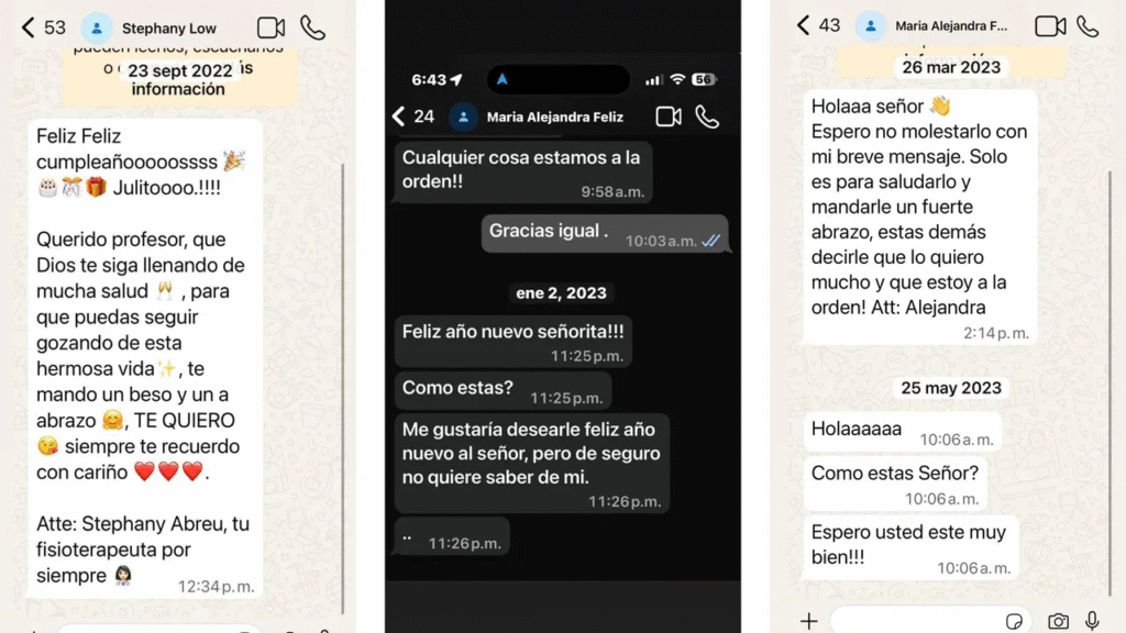 Las capturas difundidas corresponden a mensajes enviados por las denunciantes tanto durante el periodo en que trabajaron en su domicilio como después de finalizada la relación laboral. De acuerdo con Iglesias, el contenido de esas comunicaciones evidencia contradicciones entre el trato reflejado en los mensajes y las acusaciones formuladas posteriormente.